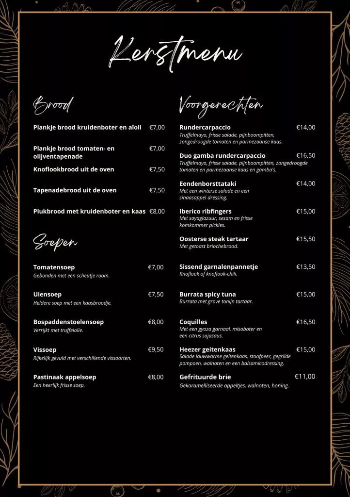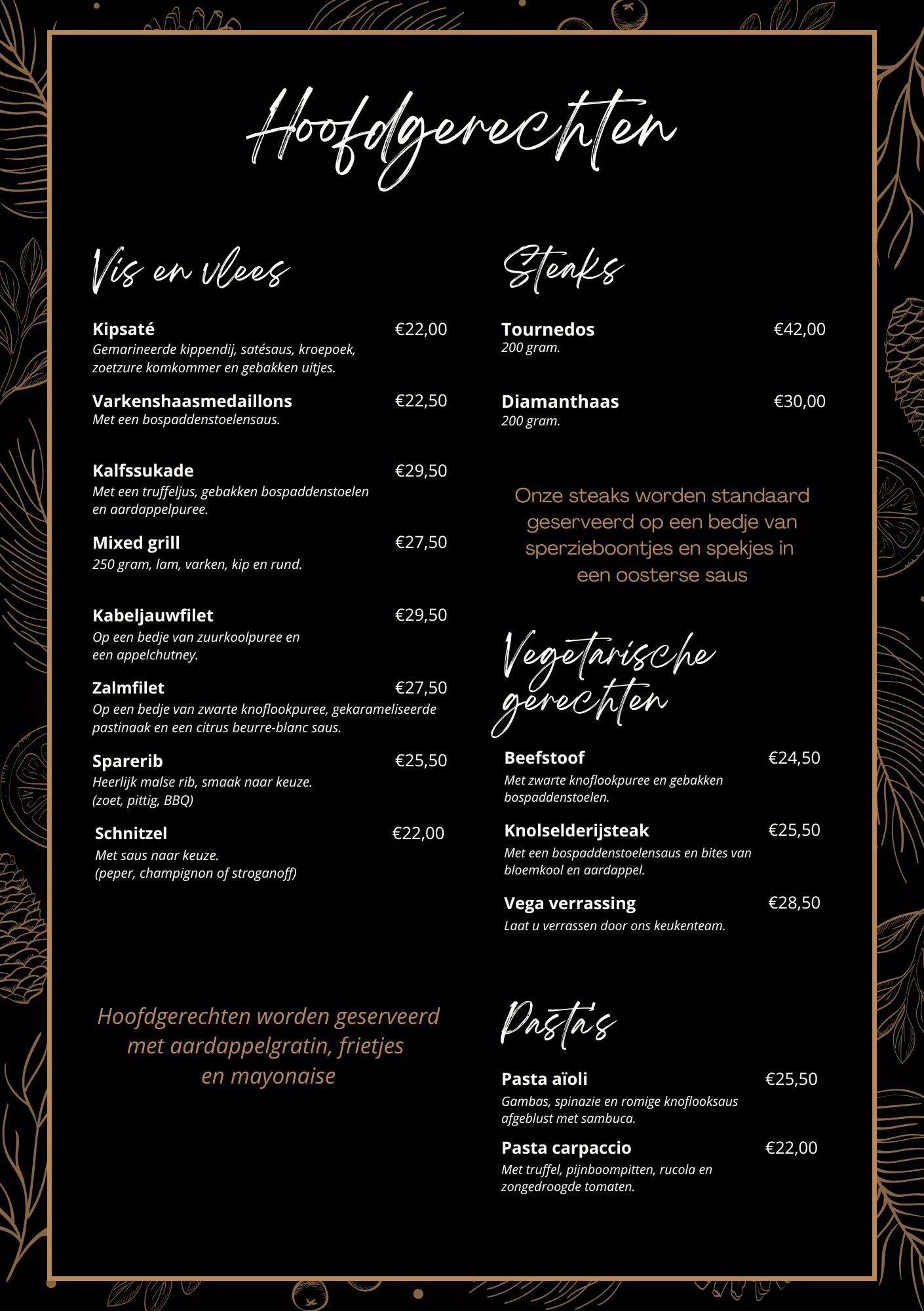 U kunt bij ons terecht vanaf 10:00 ’s ochtends voor een kopje koffie. Vanaf 11:00 kunt u heerlijk lunchen en vanaf 16:30 dineren, de keuken sluit om 21:00 waarna er uiteraard nog van onze borrelkaart besteld kan worden waar u ook vele lekkernijen op kunt vinden. Na het diner kunt u gezellig na blijven borrelen. Verder werken wij met verschillende arrangementen zoals, High Tea, High Wine, High, Beer. In onze mooie zaal die ruimte biedt voor maximaal 200 gasten kunt u ook terecht voor feesten partijen.